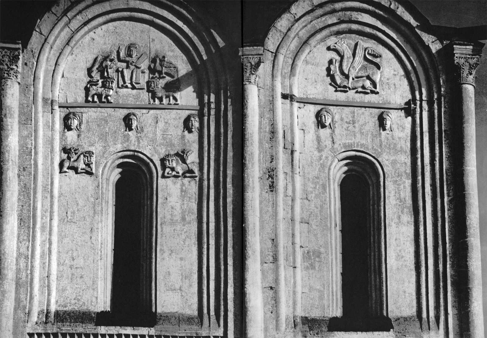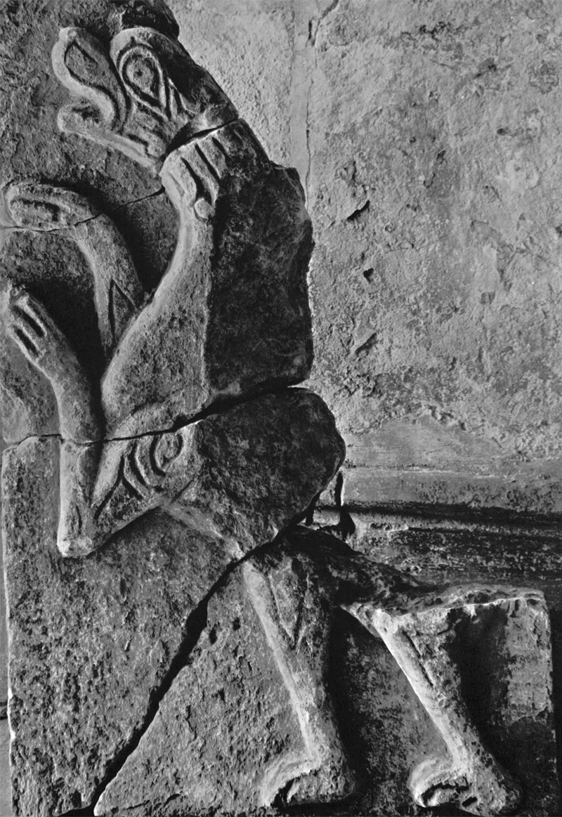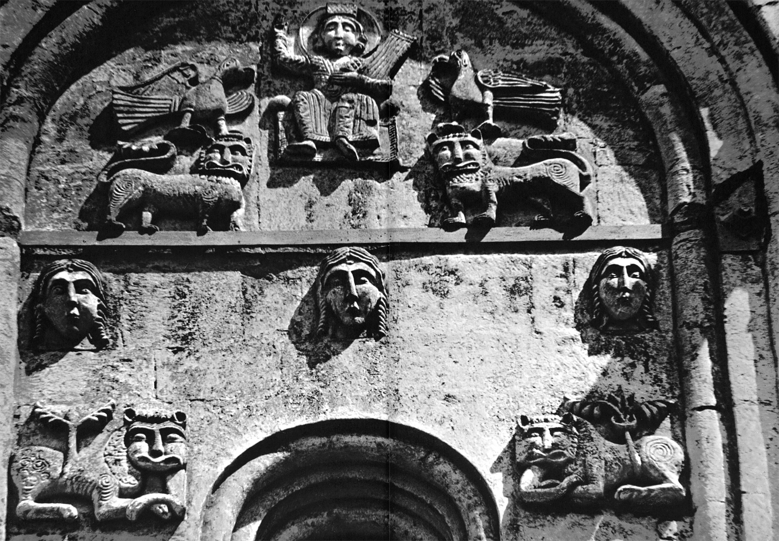 Возможно и иное толкование. На уровне верхних откосов окон центральных прясел имеются парные изображения львов, подобные тем, которые располагаются у ног пророка в тех же пряслах. Эти львы — символы княжеской власти и, кроме того, стражи храма. Они лежат, скрестив передние лапы, и кажутся дремлющими. Но глаза их открыты. Как неусыпные стражи львы помещены и в пятах подпружных арок интерьера храма. Вряд ли характеристика львов, мирно лежащих у подножия трона Давидова, и львов у окон и в пятах арок может быть совершенно противоположной. По мнению Г. К. Вагнера, они «могут означать и тех львов, которых побеждал пастух Давид (Первая книга царств, гл. 17), и львов-охранителей, и львов-спутников, или символов царя» [Г.К. Вагнер. Скульптура Владимиро-Суздальской Руси. М., 1964, стр. 109.]. Во всяком случае, поскольку момент борьбы здесь совершенно не выявлен, эти укрощенные хищники выглядят беззлобными созданиями, подчиненными творцом человеку.