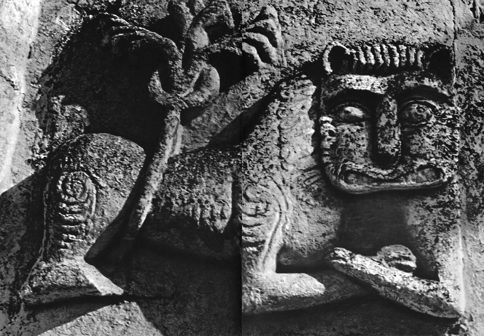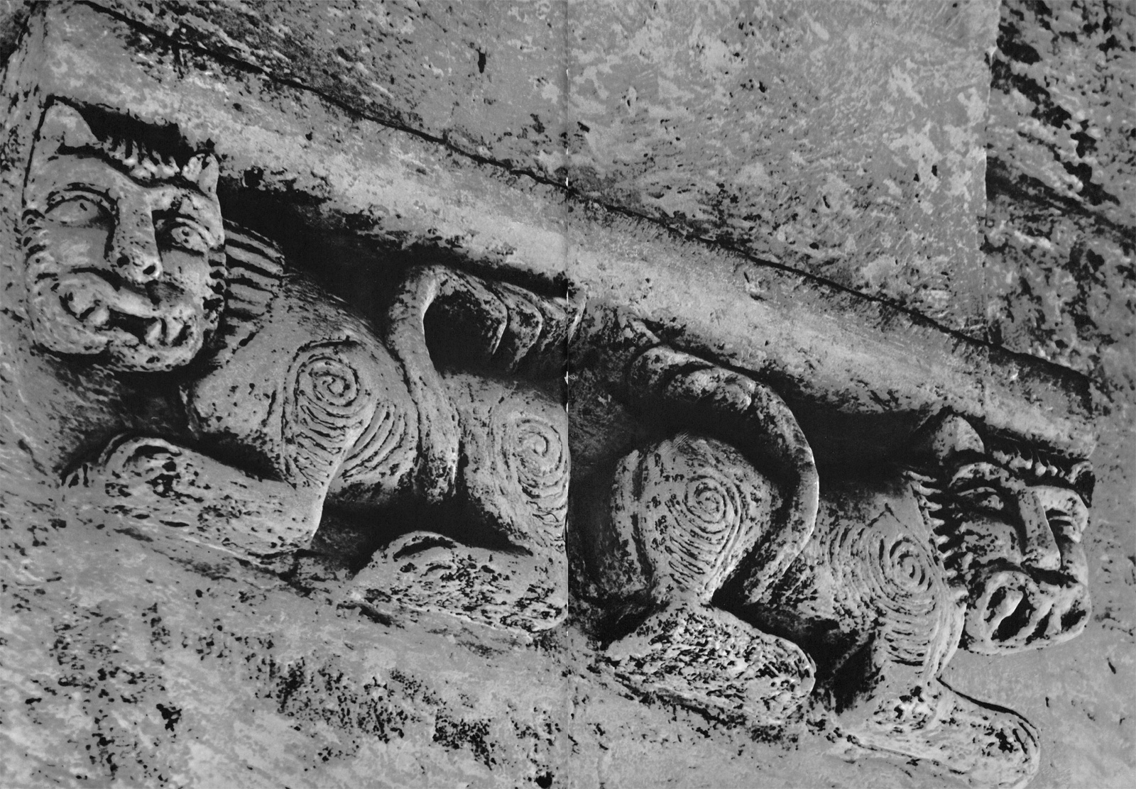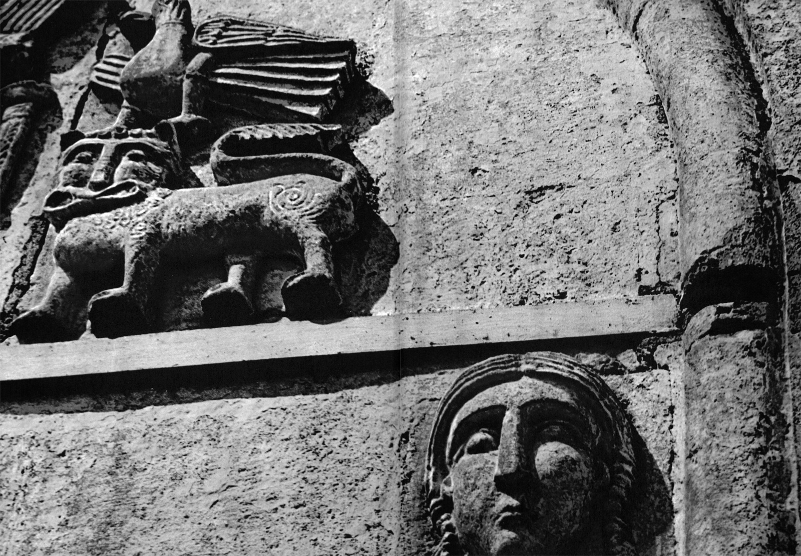 Возможно и иное толкование. На уровне верхних откосов окон центральных прясел имеются парные изображения львов, подобные тем, которые располагаются у ног пророка в тех же пряслах. Эти львы — символы княжеской власти и, кроме того, стражи храма. Они лежат, скрестив передние лапы, и кажутся дремлющими. Но глаза их открыты. Как неусыпные стражи львы помещены и в пятах подпружных арок интерьера храма. Вряд ли характеристика львов, мирно лежащих у подножия трона Давидова, и львов у окон и в пятах арок может быть совершенно противоположной. По мнению Г. К. Вагнера, они «могут означать и тех львов, которых побеждал пастух Давид (Первая книга царств, гл. 17), и львов-охранителей, и львов-спутников, или символов царя» [Г.К. Вагнер. Скульптура Владимиро-Суздальской Руси. М., 1964, стр. 109.]. Во всяком случае, поскольку момент борьбы здесь совершенно не выявлен, эти укрощенные хищники выглядят беззлобными созданиями, подчиненными творцом человеку.