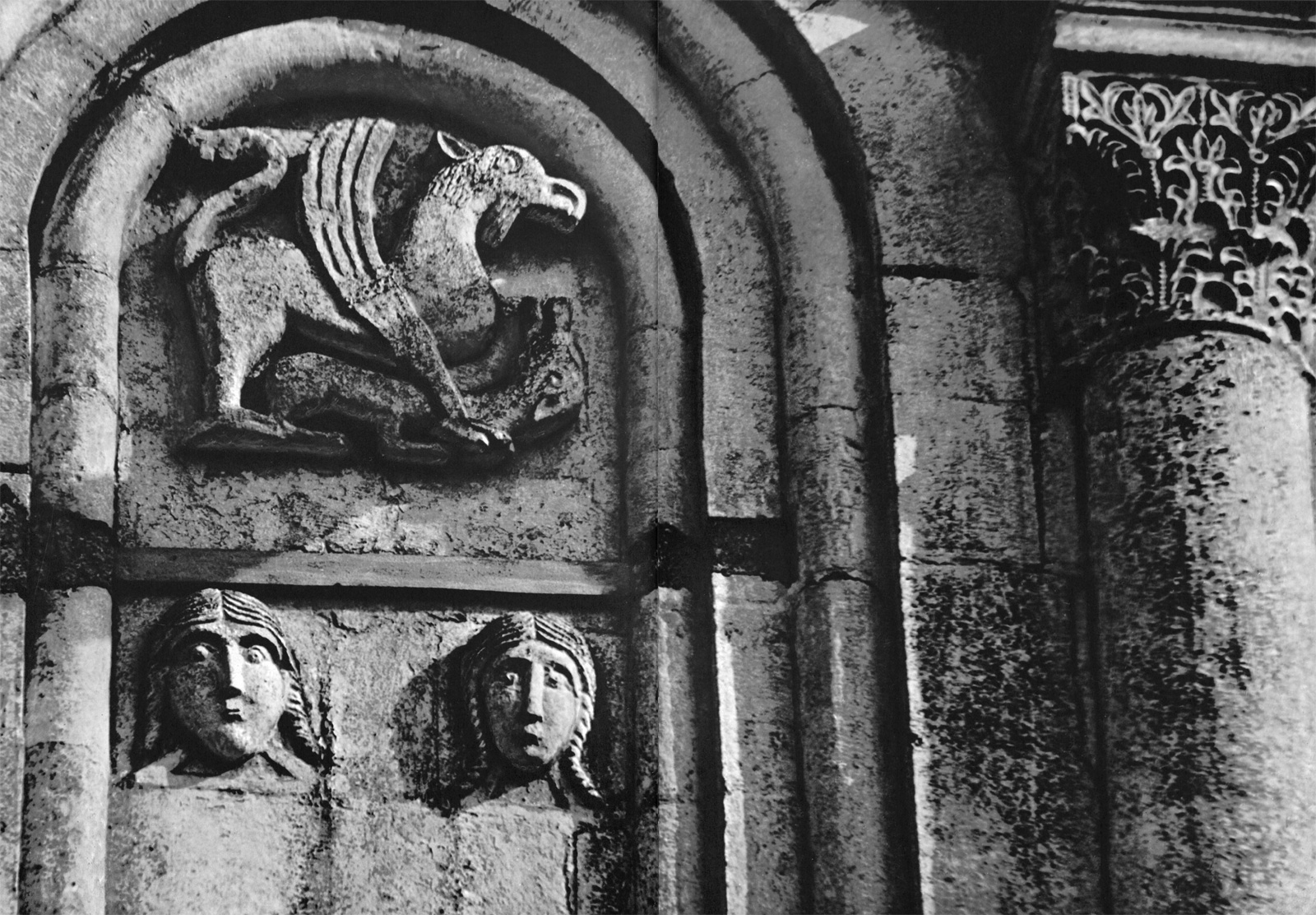 В скульптуре храма Покрова на Нерли и других храмов этого времени владимиро-суздальская пластика делала свои самые первые шаги. Мастера-резчики только нащупывали пути к соединению отдельных скульптурных групп в зрительно единый ряд. Задачу создания декоративных ансамблей будут решать их преемники. Здесь же стремление к этому наиболее отчетливо прослеживается в малозаметном на первый взгляд декоре консолей колонок аркатурного фриза. В причудливом хороводе, опоясывая церковное здание, перемешались, переплелись образы, в строгом порядке застывшие на плоскостях стен: то спокойные девичьи лица, то характерные физиономии львов, то фигурки грифонов или птиц, то тупоносые морды драконов, скорее смешные, чем страшные. Вытянутые в одну цепочку, они символизируют единство мира в его многообразии. Это мир сказочный, полный чудес и красот, мир, в котором и чудовища внушают не страх, а любопытство.