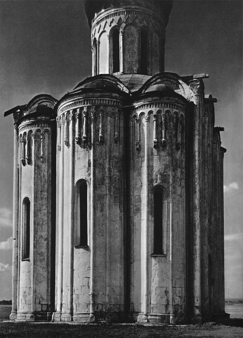 Не утеряла своей чудесной красоты и сама церковь, только скрыла ее под более скромным обличьем. Центр исторической жизни Руси постепенно удалялся от того места, где был поставлен храм. Шумная жизнь торговой пристани и звуки княжеских труб уже не нарушали его уединение. Теперь он слышал лишь шелест листвы небольшой рощицы среди глади пустынного и прекрасного луга. Бури и невзгоды времени лишили храм его царственного величия, совлекли нарядные одежды галерей, набросили на плечи вспученную кровлю-мантию, скрывшую постамент стройного барабана, и, сняв гордый золотой шелом, покрыли главу темной луковицей, словно монашеским куколем. Так, случалось, в тиши келий мирно заканчивали свой жизненный путь русские князья, перед этим много «мужествовав» и пролив немало крови в борьбе за землю Русскую или за свои корыстные интересы...