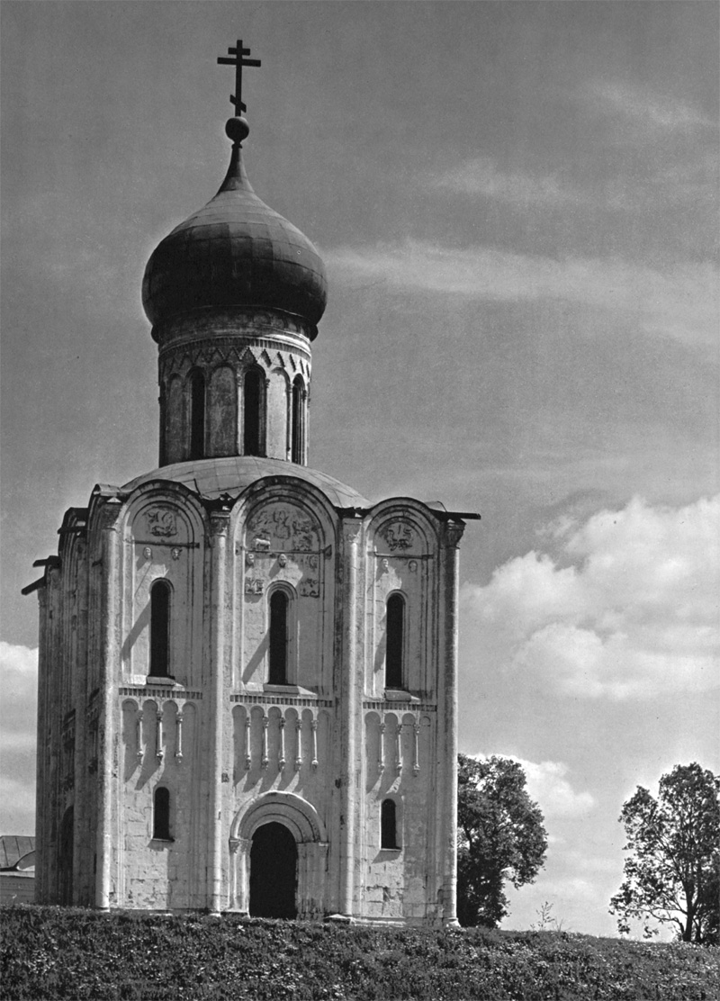 Храм Покрова на Нерли кажется созданием совсем иного мира. Он так легок и светел, словно сложен не из тяжелых каменных квадр. Все конструктивные и декоративные средства выражения, которыми располагали зодчие, подчинены здесь одной цели — передаче изящной стройности здания, его устремленности ввысь.
