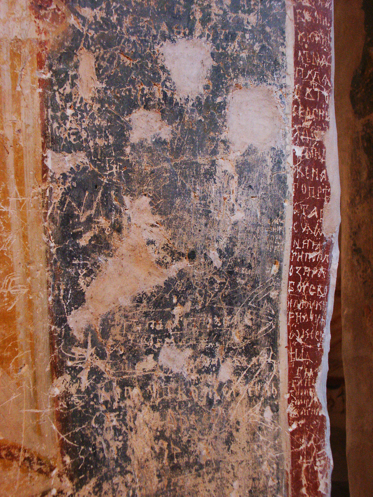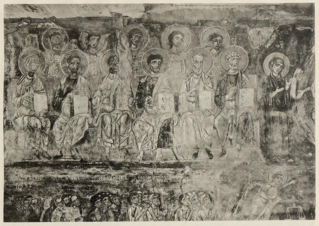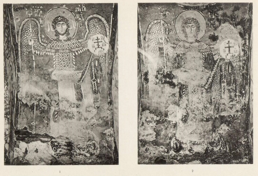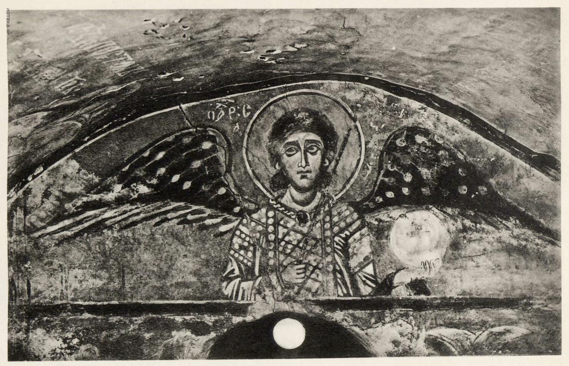 Прежде всего, это — обилие изображений ангелов. Кроме Михаила и Гавриила, написанных по обычаю на восточном своде, мы видим в каждом люнете, северном, южном и западном, вместо отдельных сложных композиций, по колоссальной поясной фигуре архангелов — Рафаила, Уриила и Селафиила. Мало того, в люнете восточной стены жертвенника помещена фигура херувима, а в нижнем поясе диаконика — изображение шестикрылого серафима в медальоне. Подобное обилие ангелов, необычное в других памятниках, мне известно только в некоторых росписях М. Азии, где оно может быть объяснено местным высоким почитанием сил небесных, особенно же архистратига Михаила.