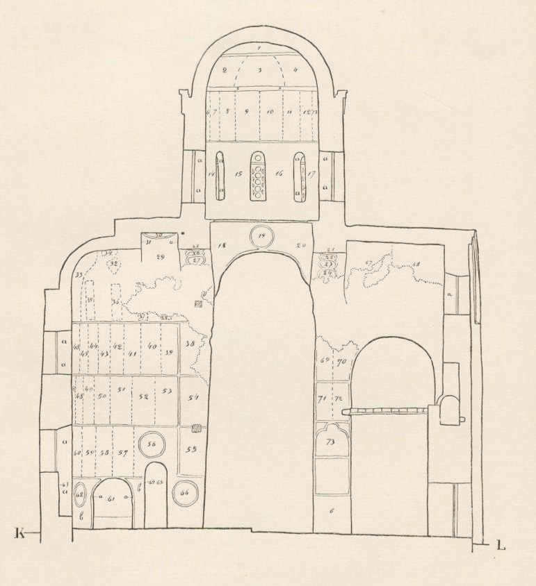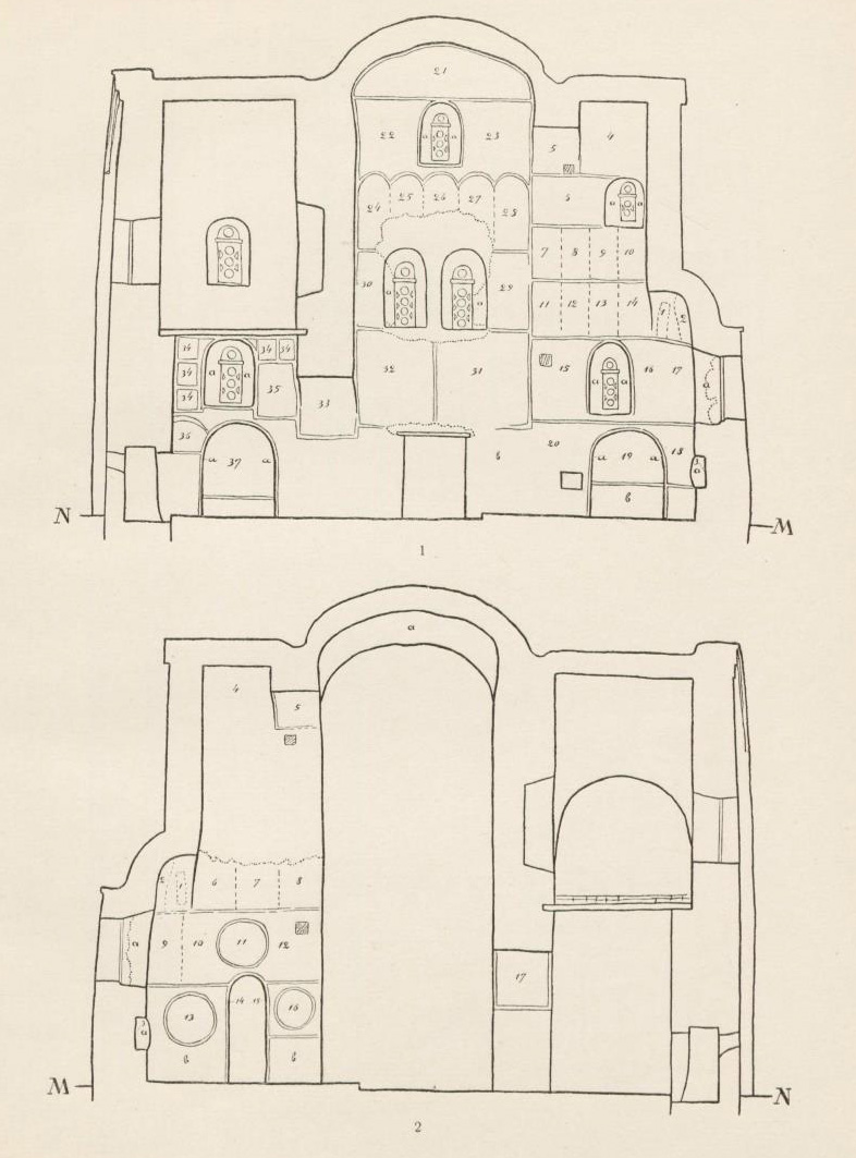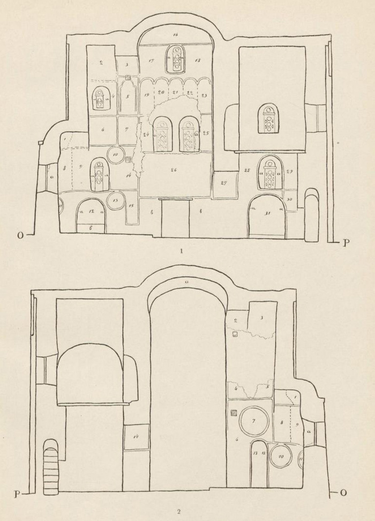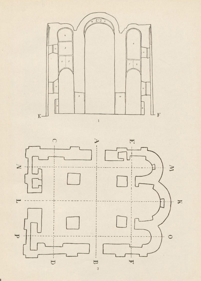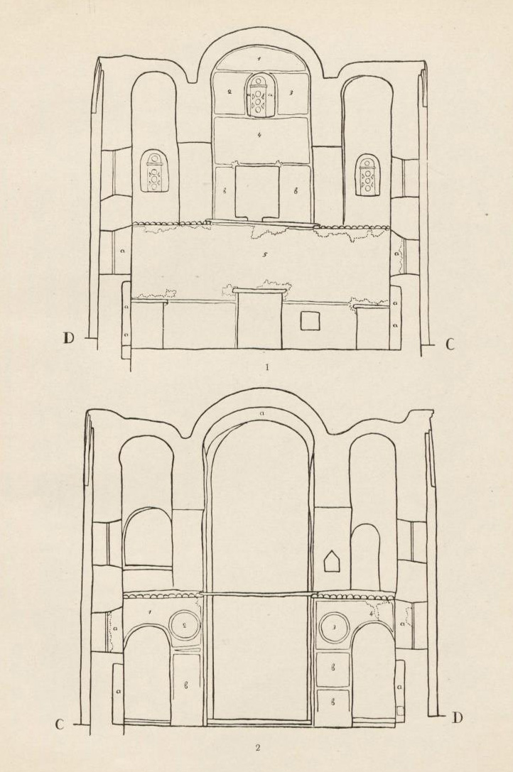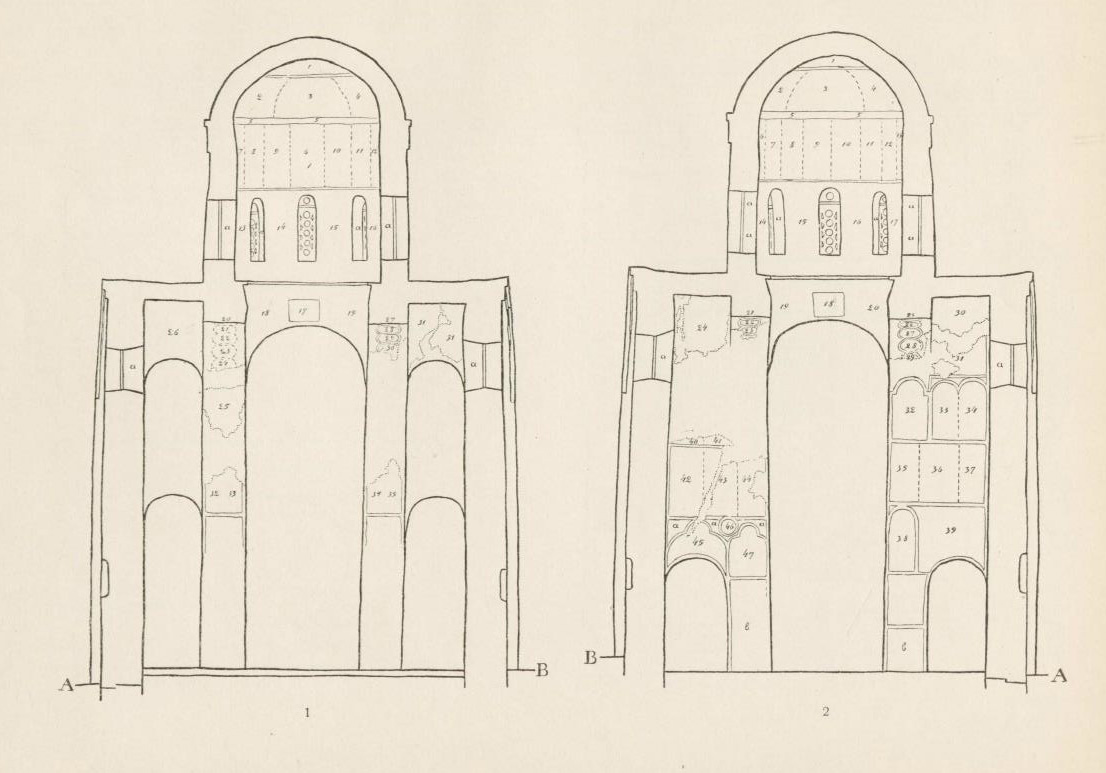 Таблица LXІІІ. 1. Вид на подпружные арки и юго-восточный парус 2. Беседа Христа с учениками