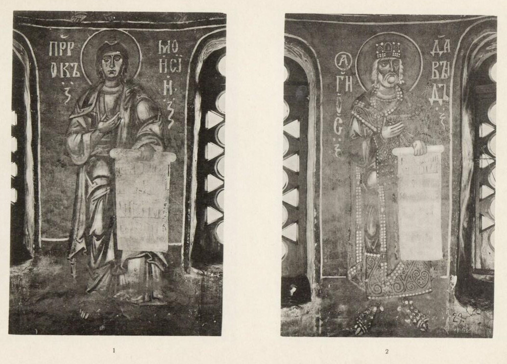 Наконец, как на наиболее важное для русских древностей нововведение следует указать на фигуры свв. Бориса и Глеба. Это древнейший дошедший до нас образец их изображений в храмовой росписи (табл. XXIV).