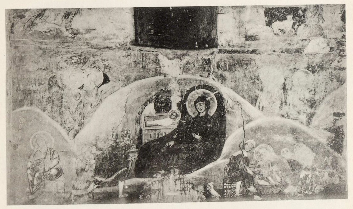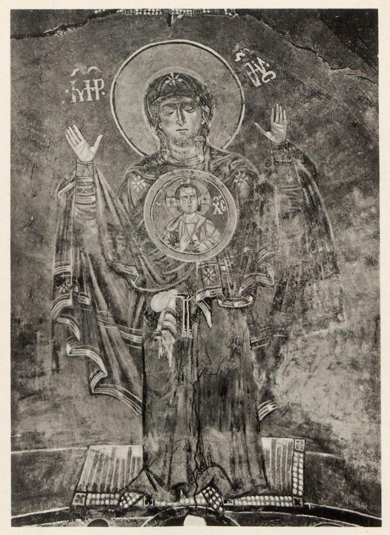 Далее следует отмстить, что в Передние Богородица-Оранта в апсиде представлена уже с медальоном младенца Эммануила на груди, как в мозаиках Вифлеемской базилики, исполненных в 1169 г. и во многих росписях XIV—XV ст.