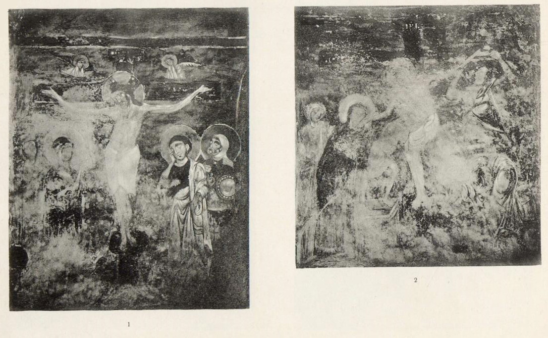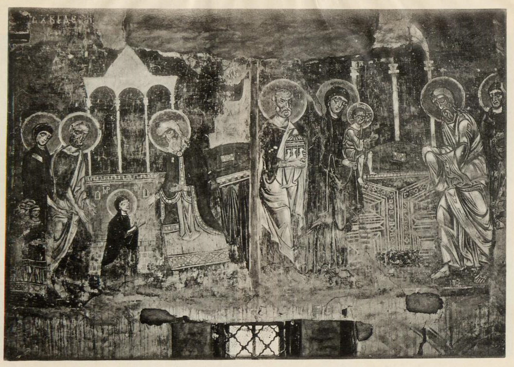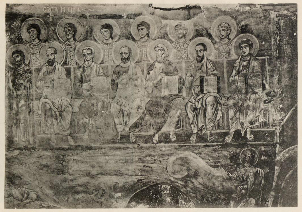 Наконец, остается отметить еще два пошиба. Один из них отличается очень странной не византийской драпировкой складок и плоскими, почти сплошь забеленными лицами и напоминает некоторые романские фрески Бриксена, а особенно те фрески, которые были недавно открыты в церкви S. Croce di Gerusalemme в Риме. Другой пошиб, очень грубый и неискусный, имеет большие точки соприкосновения с росписью капеллы Quattro Coronati в том же Риме.