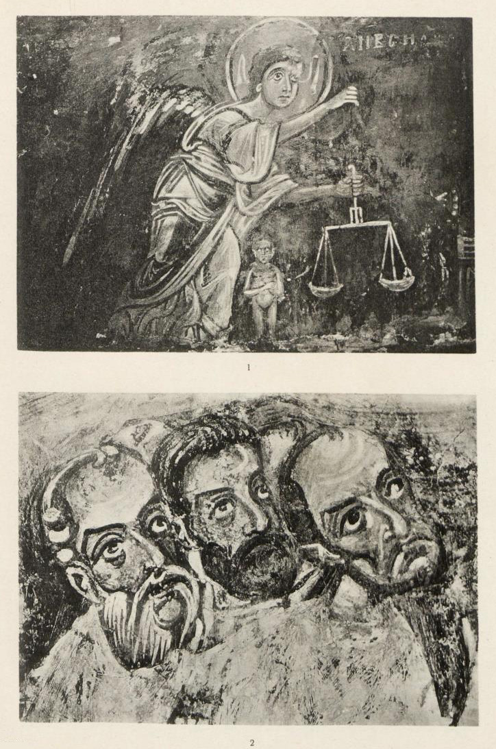 Таблица LXXII. 1. Ангел с весами – деталь страшного суда 2. Лик отцов церкви – деталь страшного суда