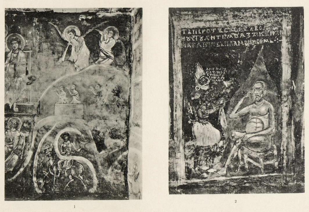 К числу таких же редкостей приходится отнести и любопытную сцену, входящую в состав сложной композиции Страшного Суда и помещенную на северной стене, под изображением адских мучений. Здесь представлен богач, сидящий в огне, а перед ним сатана с сосудом в руках. Эта сцена, как выясняется из надписи, стоит в связи с помещенной напротив, на южной стене, фигурой Авраама с душою Лазаря в лоне. Богач показывая себе на язык, взывает к Аврааму:  «ѻ҆́тче а҆враа́ме, поми́лѹй мѧ̀, и҆ послѝ ла́зарѧ, да ѡ҆мо́читъ коне́цъ пе́рста своегѡ̀ въ водѣ̀ и҆ ѹ҆стѹди́тъ ѧ҆зы́къ мо́й: ѩ҆́кѡ стра́ждѹ во пла́мени се́мъ» («отче Аврааме! умилосердись надо мною и пошли Лазаря, чтобы омочил конец перста своего в воде и прохладил язык мой, ибо я мучаюсь в пламени сём» (Евангелие от Луки 16:24, Синодальный перевод), на что сатана подносит ему сосуд с огнем и говорит: дроуже богатый испей горящаго пламени.